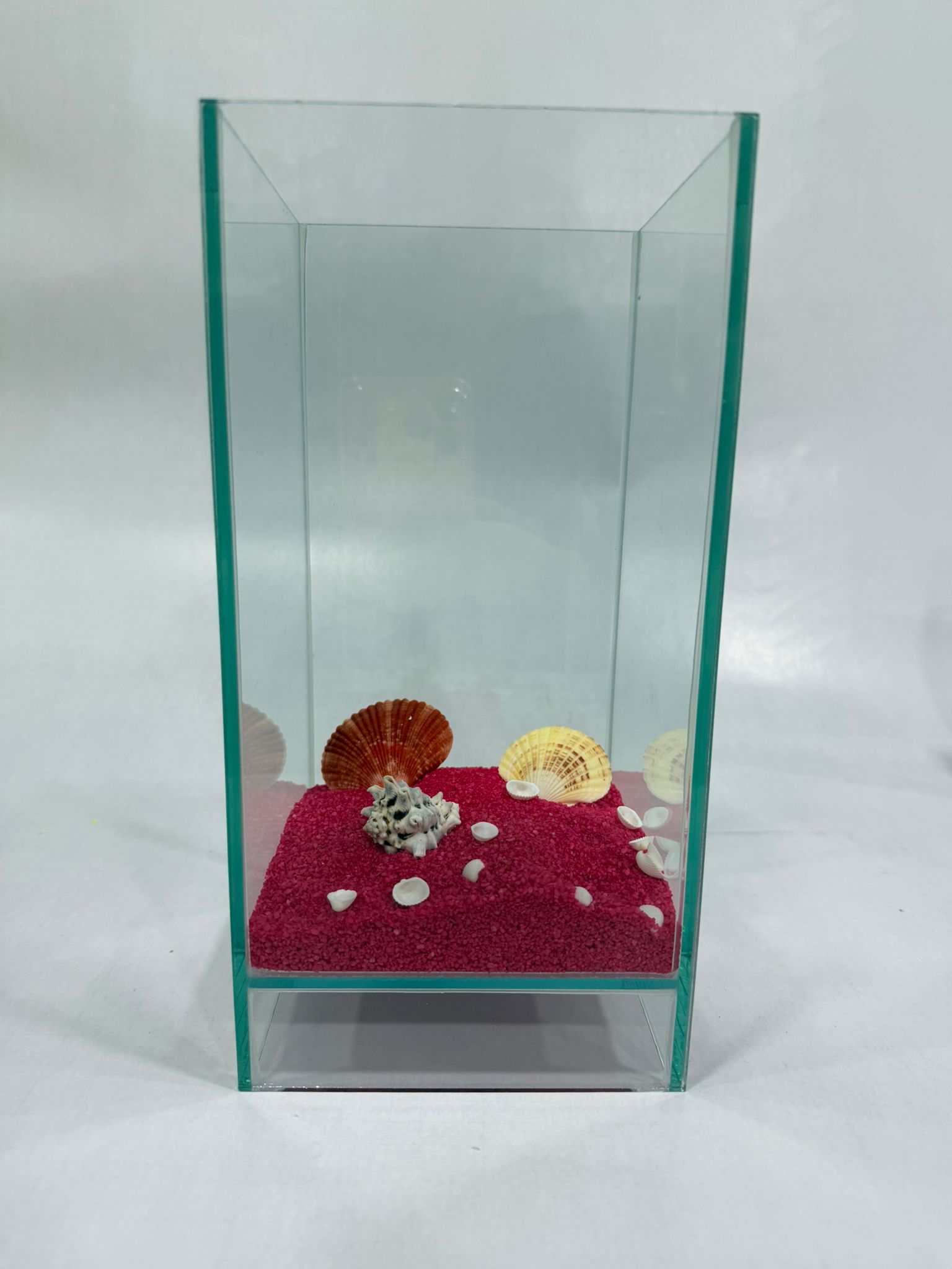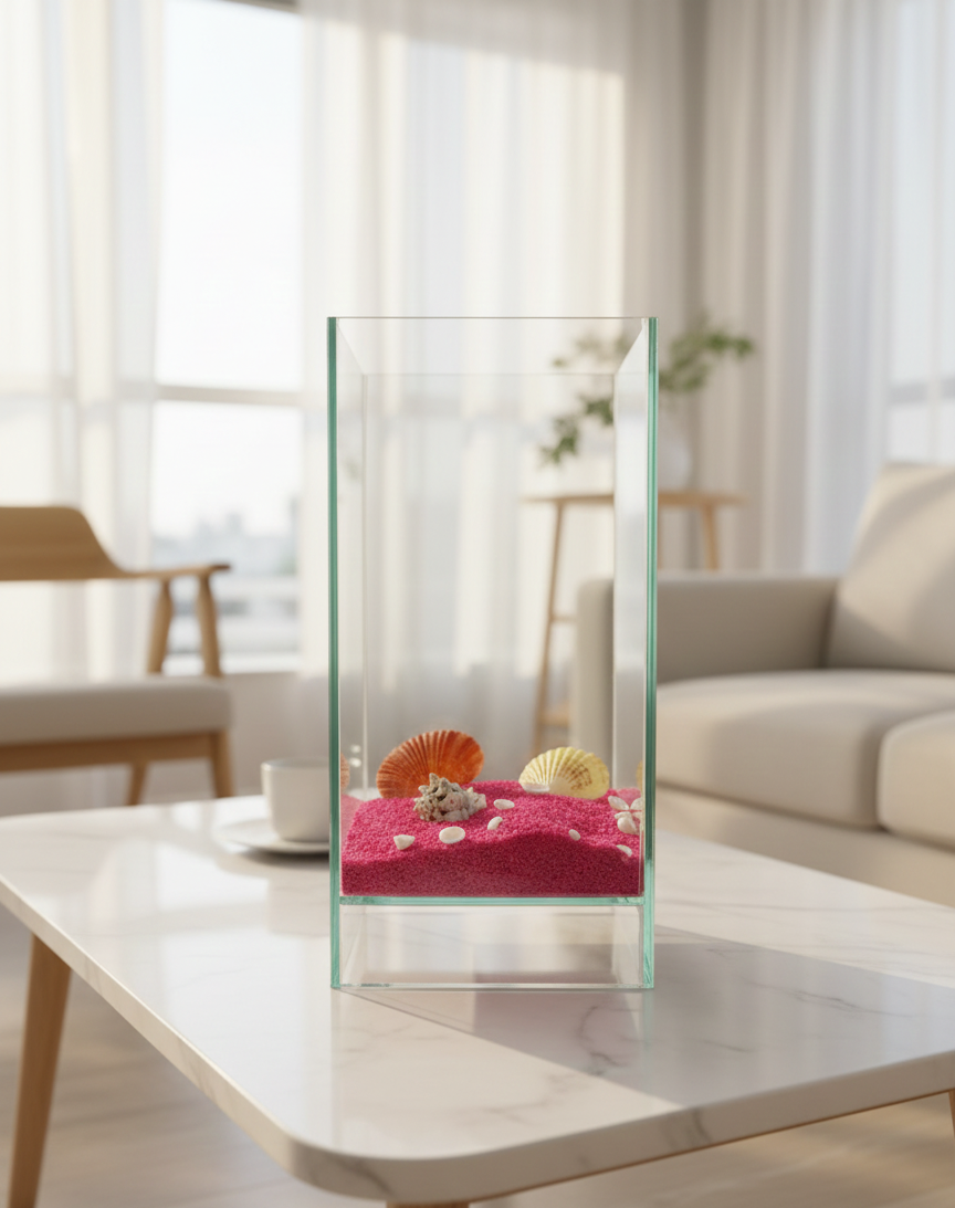 Dekoratif cam kutu içerisinde yer alan doğal deniz kabukları ve canlı renkli kum, mekânlara ferah ve estetik bir görünüm kazandırır. El yapımı düzenleme sayesinde her ürün kendine özgüdür. Şeffaf cam yapısı sayesinde ışığı güzel yansıtır ve bulunduğu alanda zarif bir dekoratif obje olarak öne çıkar.