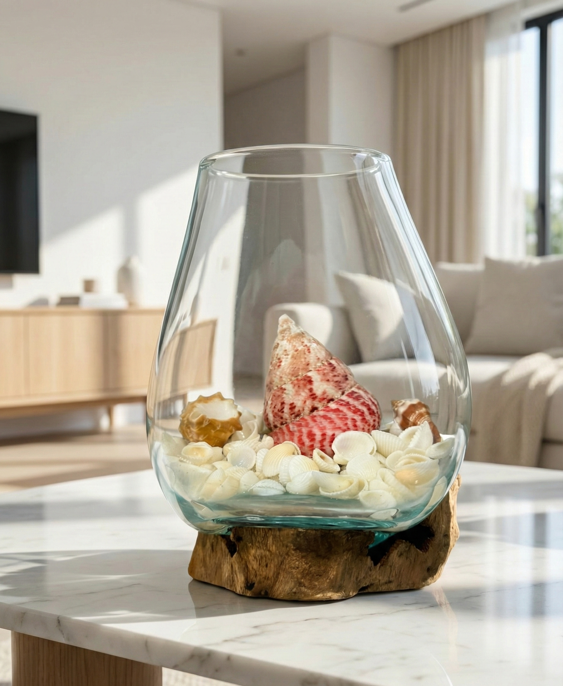 Deniz Kabuğu Dolgusu: Vazo içerisinde, hafif krem ve beyaz tonlardaki küçük midyeler (istiridye kabukları) ve odak noktası oluşturan canlı kırmızı-beyaz desenli spiral deniz kabuğu (salyangoz kabuğu) bulunmaktadır.